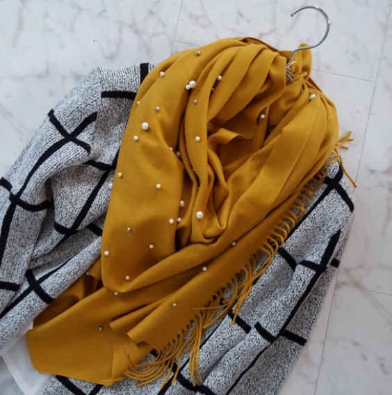今回ご紹介するストールはアクセサリー感覚でつけられるパールつきのストールなのです!