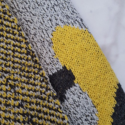 このカーディガンの黄色は黄みと青みの中間なので、春にも秋にも取りれやすいカラーです。